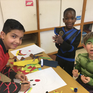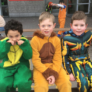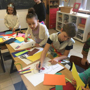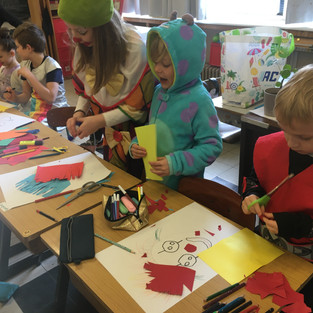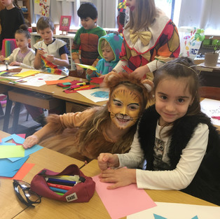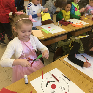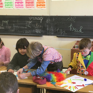 Prins en prinses Carnaval kwamen op bezoek. We hebben allemaal onze mooiste outfits laten zien. Nadien hebben we samen met enkele leerlingen van 1B en 4C een clown geknutseld en een pannenkoek gesmikkeld. Het was een super fijne dag. - er staat ook een mooi bouwwerk van enkele jongens van 1C tussen de foto's