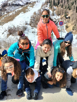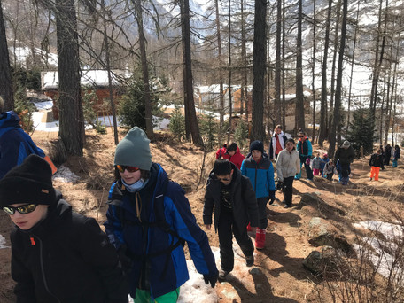 We trokken opnieuw het oude dorp in en speurden de straatjes af naar ballonnen die de juffen en meesters hadden opgehangen. De ballonnen wezen ons de weg naar het eindpunt van de tocht. Af en toe viel er een briefje uit de ballon en moest er een opdracht uitgevoerd worden. De ene opdracht al gekker dan de anderen. We hadden heel wat bekijks. De koeienboer lachte ons vanuit zijn koeienstal vrolijk toe en kreeg van ons nog een erehaag toen hij onze belhamels wat later met zijn tractor passeerde. Nadien ging onze tocht verder de bergen in. We volgden een bospaadje en kwamen bij een indrukwekkende hangbrug die over een gigantische lawinekom was gespannen. Je mocht er met 50 tegelijkertijd op. Mooi dus, want laat dat nu het exacte aantal Stanners zijn dat dit dal onveilig maakt. En voor alle ongeruste ouders: We zijn dus nog niemand kwijtgespeeld!